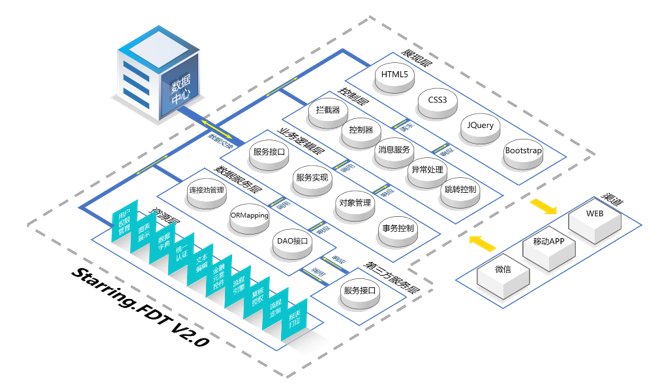 采用HTML5+CSS+JS技术,支持多种开发模式;支持多终端设备自适应排版布局;集成50多种表单组件,20多种图表组件,10多种主题样式;内置用户体系、权限体系、菜单体系、微服务体系、版本管理体系等前端应用管理功能。